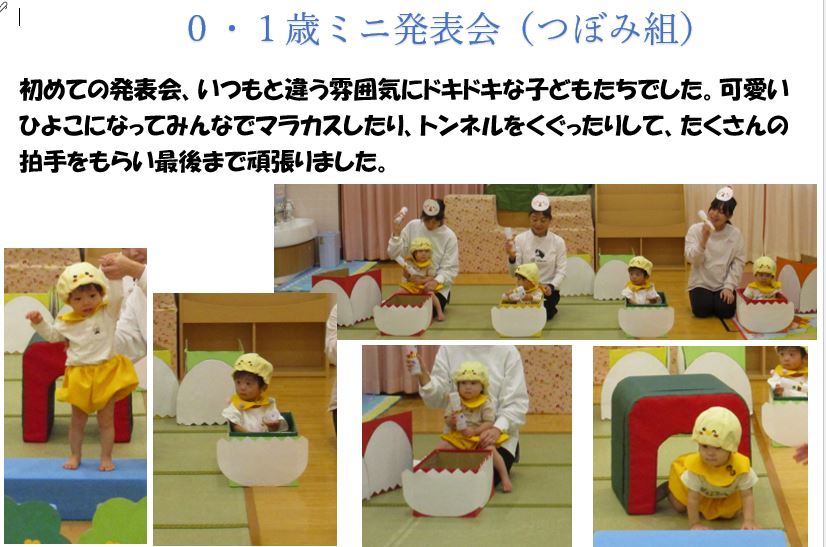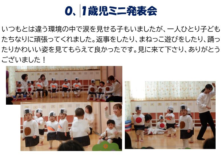 今年は、0歳児クラスと1歳児クラスそれぞれのミニ生活発表会をしてみました。保護者の皆さんの前で頑張って演技してくれました。